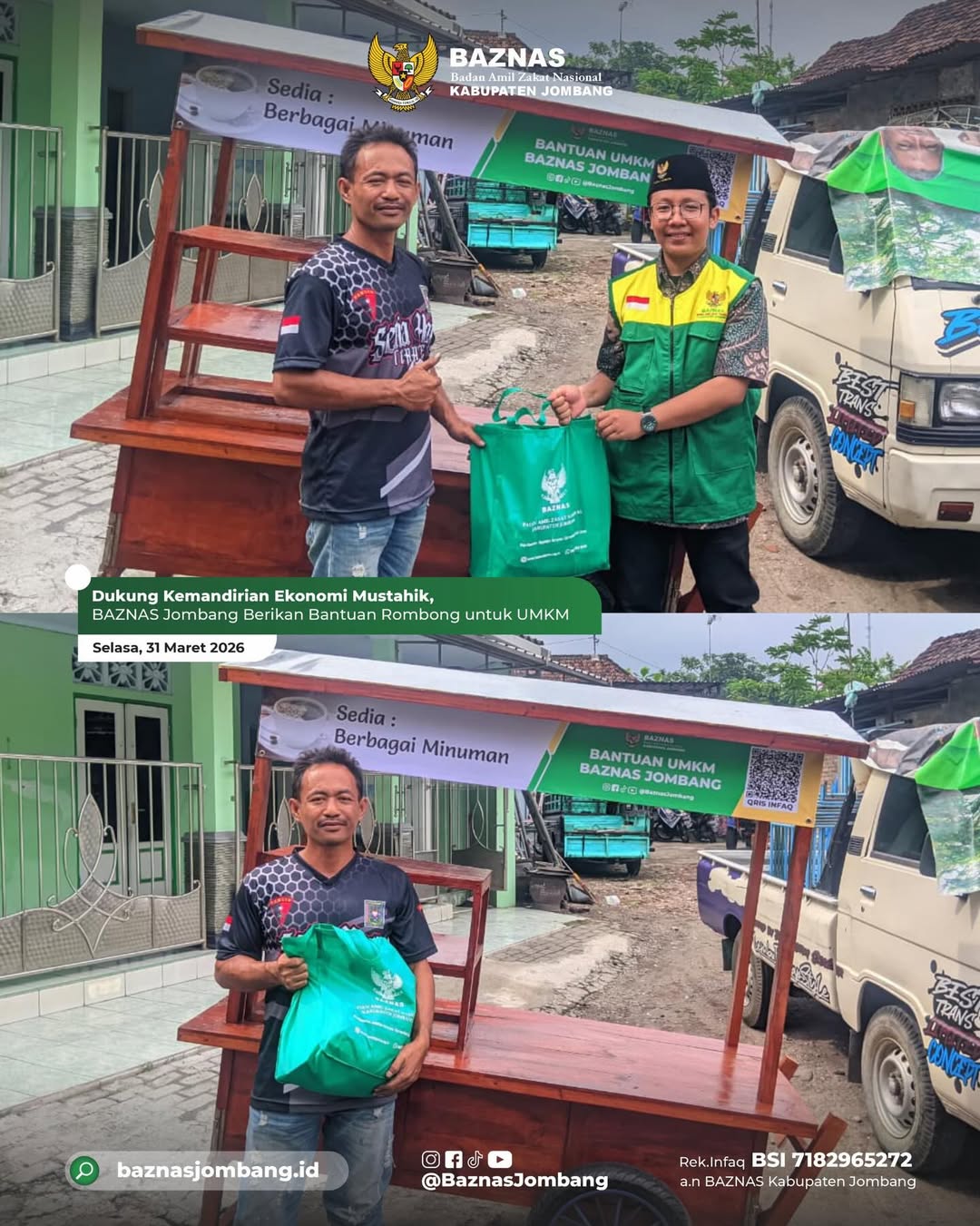 Jombang — Badan Amil Zakat Nasional (BAZNAS) Kabupaten Jombang terus mendorong kemandirian ekonomi masyarakat melalui program pemberdayaan mustahik. Salah satu langkah konkret diwujudkan dengan penyaluran bantuan berupa rombong usaha kepada pelaku UMKM.