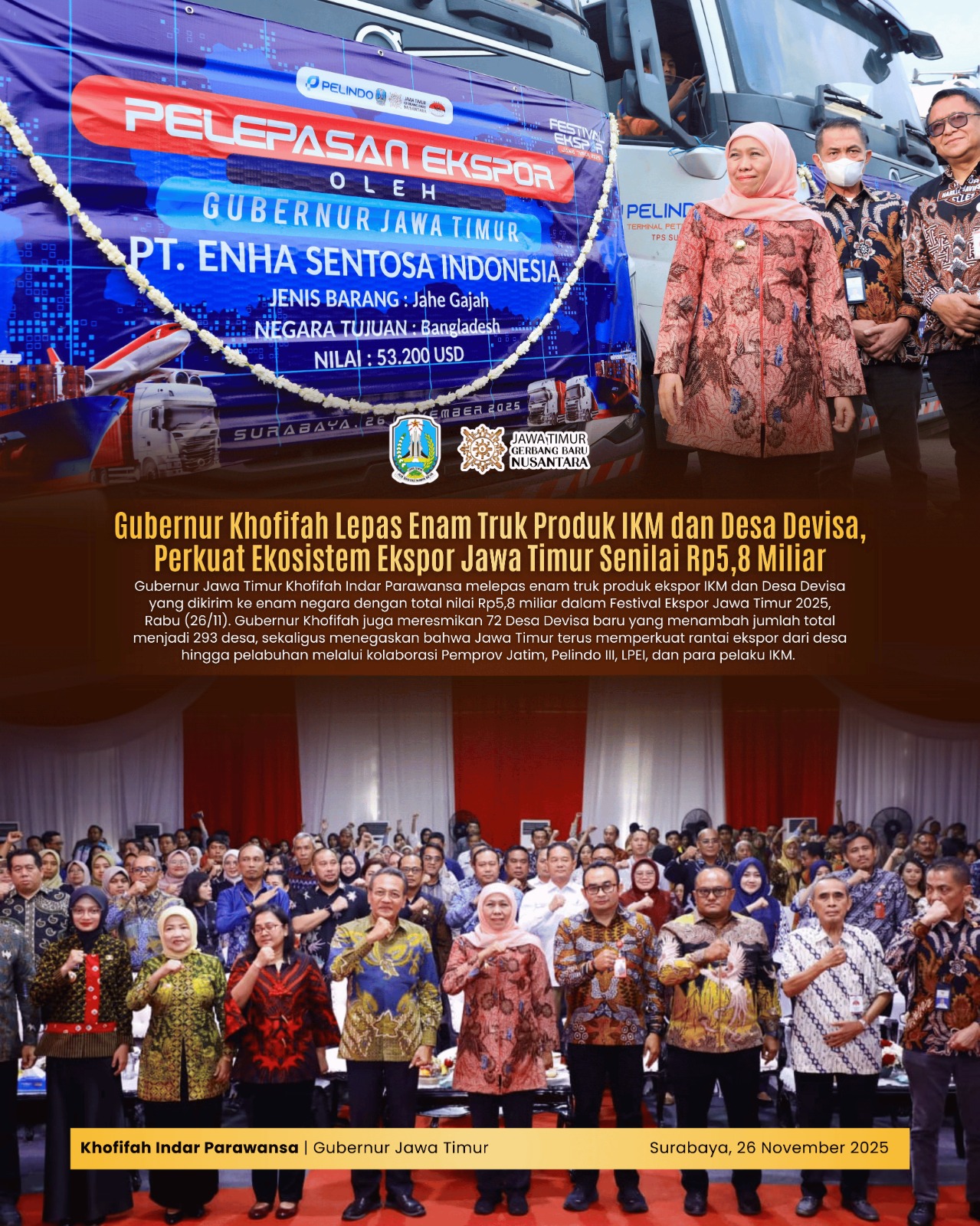 Gubernur Jawa Timur Khofifah Indar Parawansa melepas enam truk produk ekspor Industri Kecil Menengah (IKM) Desa Devisa Jawa Timur dengan nilai total USD351,6 ribu atau setara Rp5,8 miliar. Pelepasan dilakukan dalam gelaran Festival Ekspor Jawa Timur 2025 yang berlangsung di PT Terminal Petikemas Surabaya (TPS), Rabu (26/11).