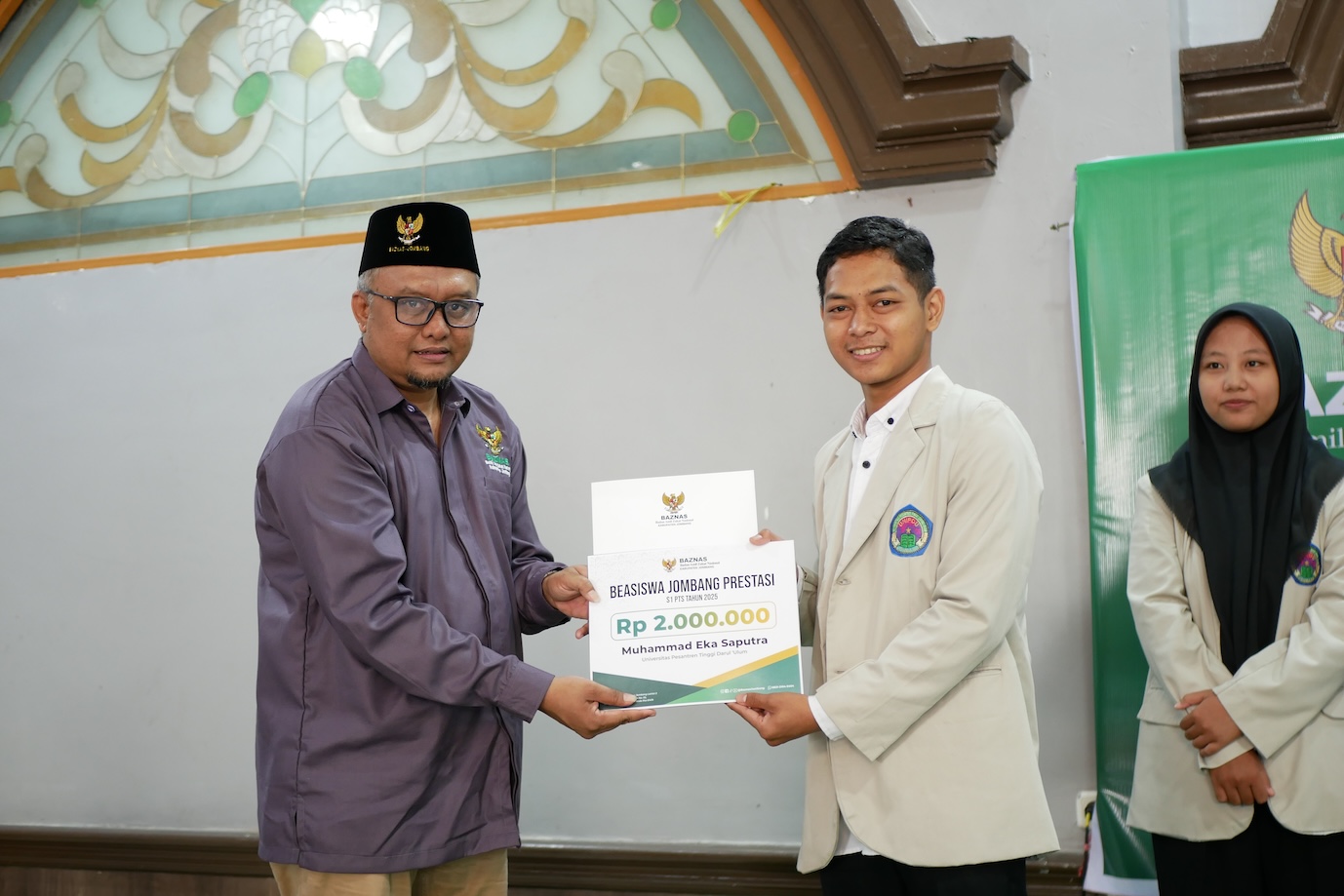 JOMBANG — Dua mahasiswa Universitas Pesantren Tinggi Darul Ulum (UNIPDU) Jombang berhasil meraih Beasiswa Jombang Prestasi Tahun 2025 yang diselenggarakan Badan Amil Zakat Nasional (Baznas) Kabupaten Jombang. Penyerahan beasiswa dilakukan pada Rabu (19/11/2025), bersamaan dengan agenda resmi Penyerahan Beasiswa Jombang Prestasi Strata 1 Perguruan Tinggi Swasta Tahun 2025.