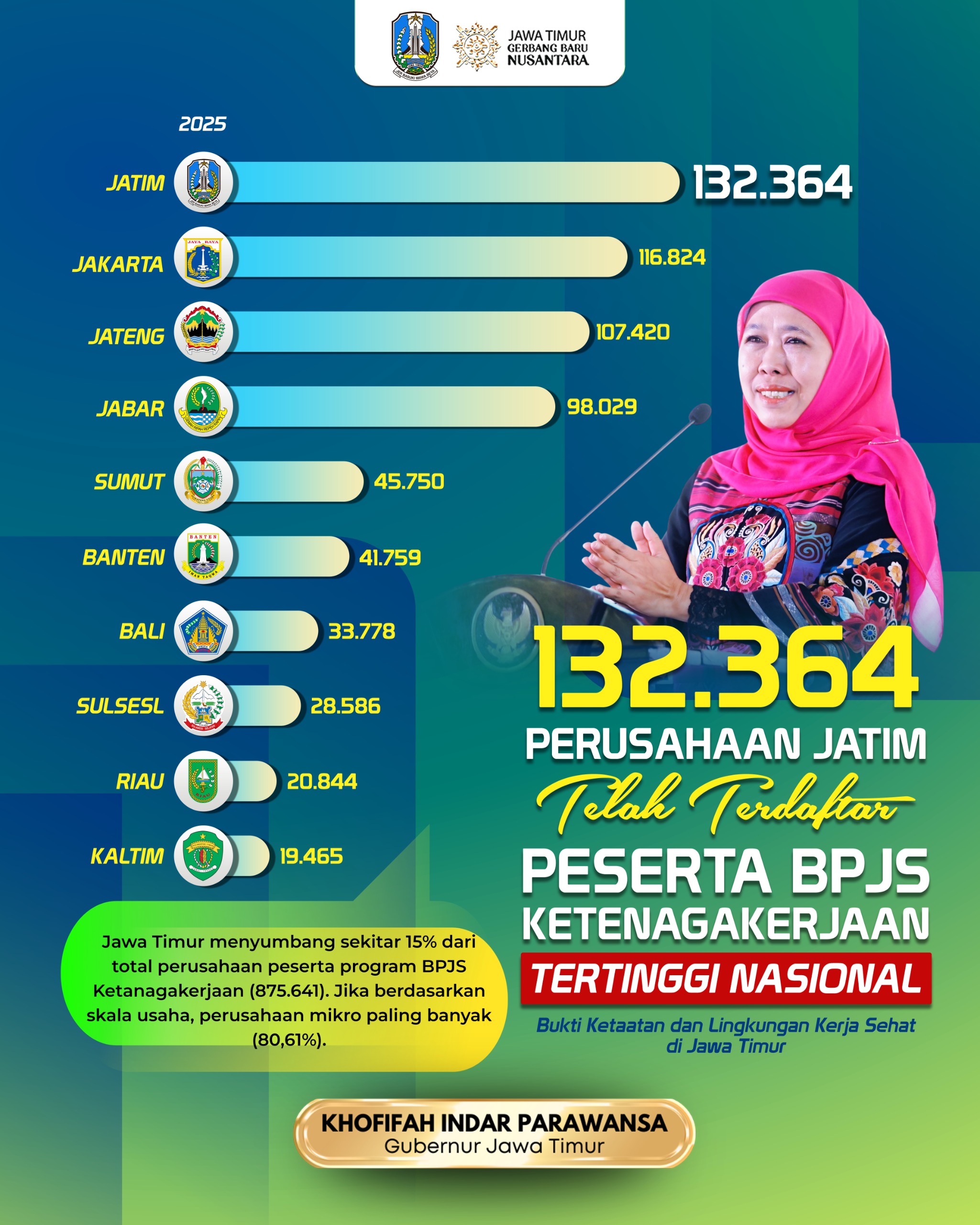 "Secara nasional, total perusahaan peserta program BPJS Ketenagakerjaan tercatat sebanyak 875.641 perusahaan. Dan Alhamdulillah Jawa Timur menyumbang angka terbanyak untuk itu," jelas Gubernur Khofifah.