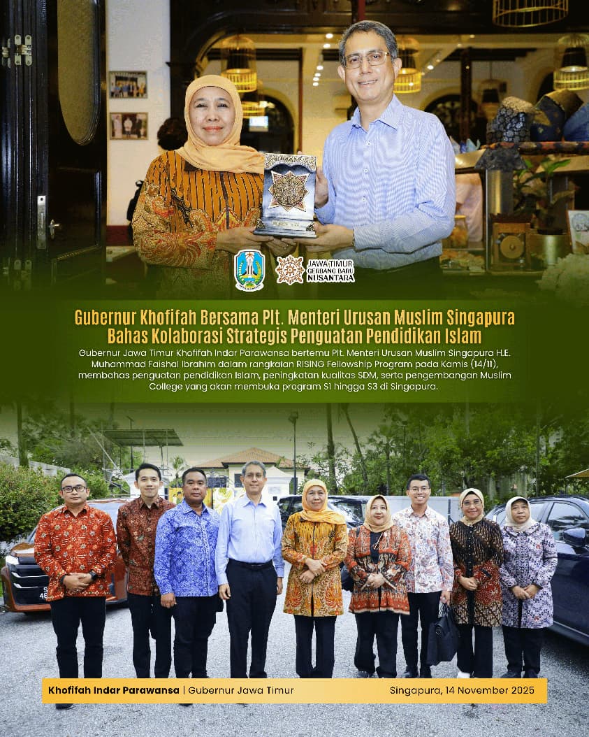 Gubernur Jawa Timur Khofifah Indar Parawansa mengakhiri program RISING Fellowship di Singapura dengan melakukan pertemuan bersama Plt. Menteri Urusan Muslim Singapura, H.E. Muhammad Faishal Ibrahim di Permata Restaurant, Kampong Glam, Singapura, Kamis (14/11).