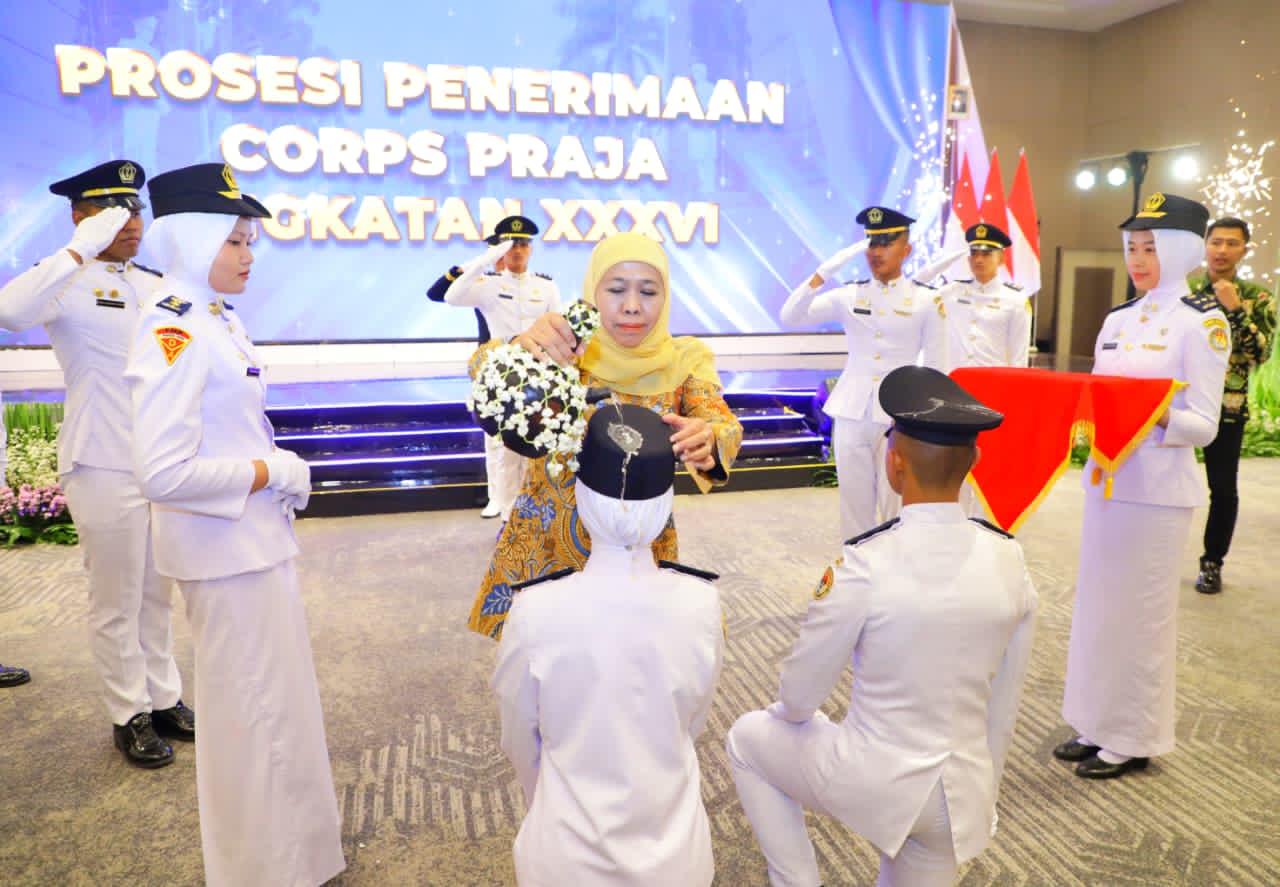 Sebagai Alumni Kehormatan Institut Pemerintahan Dalam Negeri (IPDN), Gubernur Khofifah turut melaksanakan prosesi penerimaan Korps Praja Angkatan XXXVI dengan menyematkan dek atau tanda pangkat kepada dua perwakilan Praja Pratama, yang dilanjutkan dengan prosesi penyiraman air bunga.