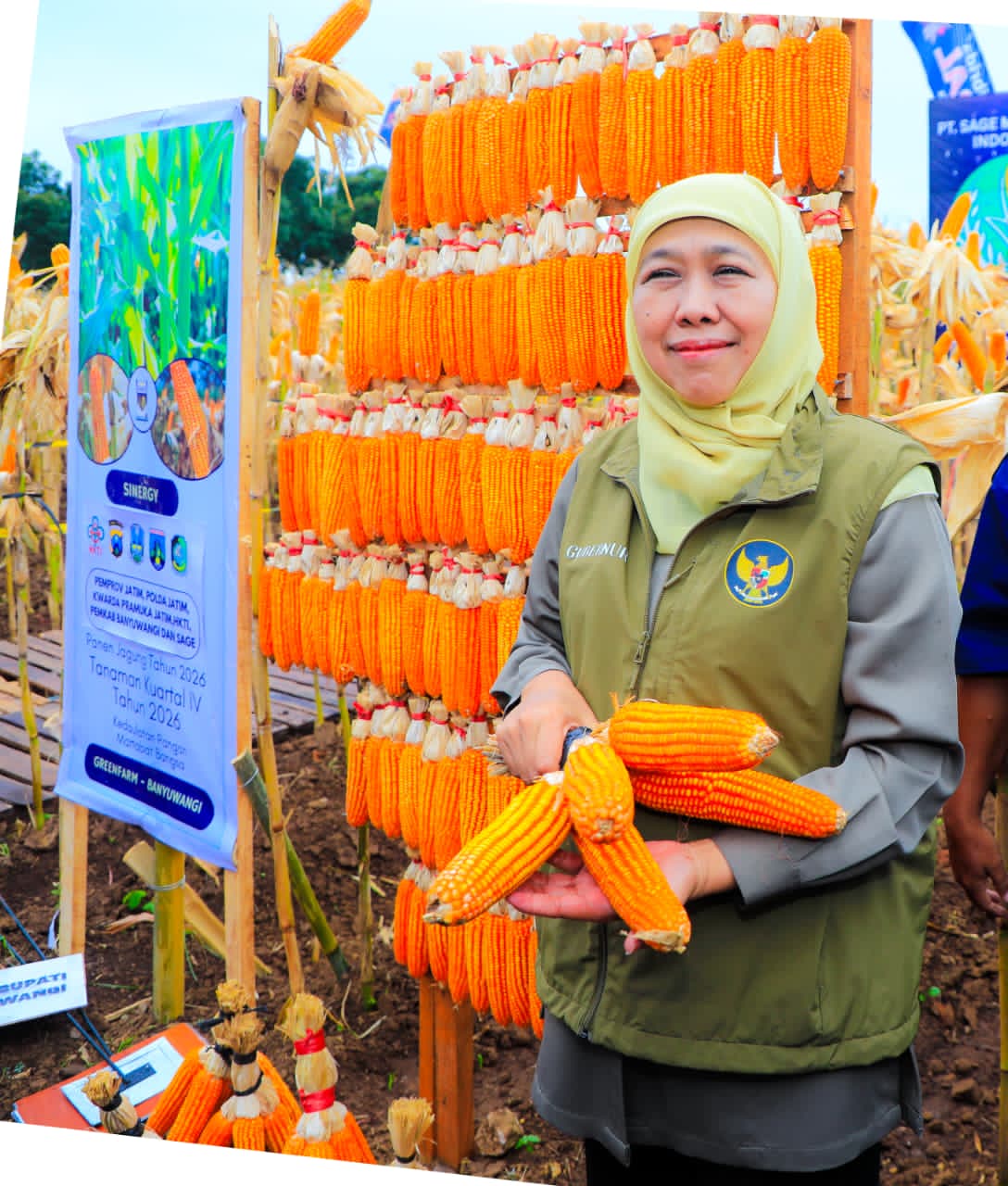 BANYUWANGI, 1 Maret 2026 – Gubernur Jawa Timur Khofifah Indar Parawansa bersama Kapolda Jatim Irjen Pol Nanang Avianto, Bupati Banyuwangi Ipuk Fiestiandani, Ketua Kwarda Pramuka Jatim dan Ketua Himpunan Kerukunan Tani Indonesia (HKTI) Jatim H. M. Arum Sabil melaksanakan panen jagung hasil tanam kuartal IV Tahun 2025 di Pusat Pelatihan Pertanian Taruna Bumi, Green Farm, Desa Karangsari, Kecamatan Sempu, Kabupaten Banyuwangi, Sabtu (28/2).
