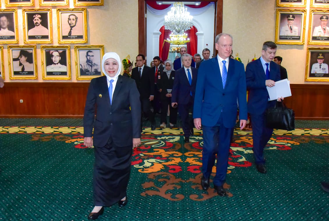 Gubernur Jawa Timur Khofifah Indar Parawansa menerima kunjungan kehormatan Penasihat Presiden Federasi Rusia, H.E. Nikolai Patrushev, bersama delegasi tingkat tinggi Dewan Maritim Federasi Rusia di Gedung Negara Grahadi, Surabaya, Rabu (5/11).