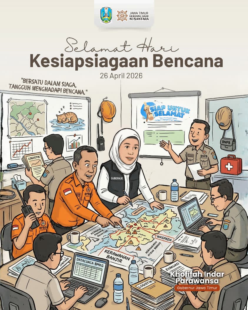 Hal itu secara khusus disampaikan Gubernur Khofifah di Peringatan Hari Kesiapsiagaan Bencana Tahun 2026 yang jatuh pada hari ini, Minggu 26 April 2026.