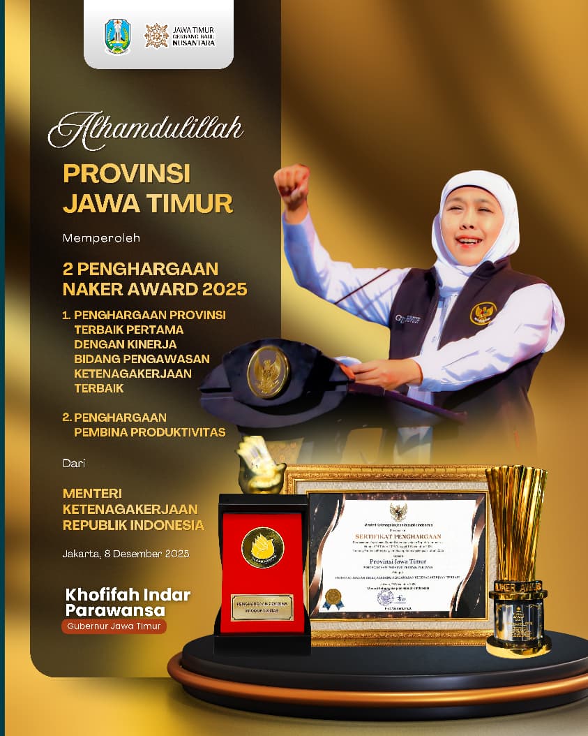 JAKARTA, 9 DESEMBER 2025 – Gubernur Jawa Timur Khofifah Indar Parawansa kembali menorehkan prestasi di panggung nasional. Tidak tanggung-tanggung, dua penghargaan sekaligus diraih dalam ajang Naker Award 2025. Yaitu Penghargaan Pembina Produktivitas dan Penghargaan Terbaik Pertama Provinsi dengan Kinerja Bidang Pengawasan Ketenagakerjaan Terbaik.