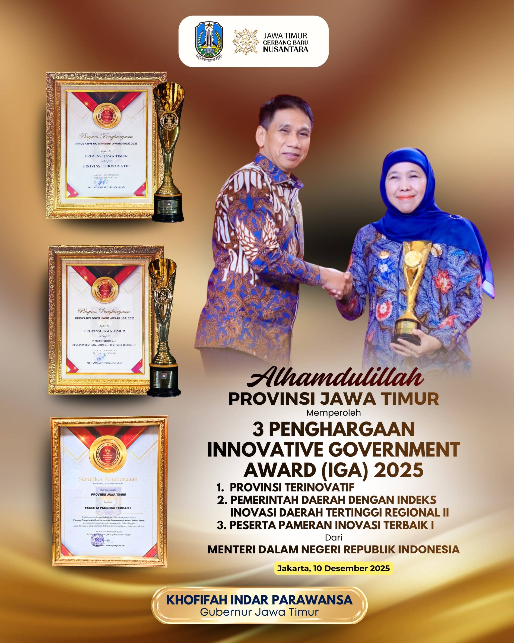 JAKARTA, 10 DESEMBER 2025 – Pemerintah Provinsi Jawa Timur berhasil meraih tiga penghargaan bergengsi dalam ajang Innovative Government Award (IGA) Tahun 2025.