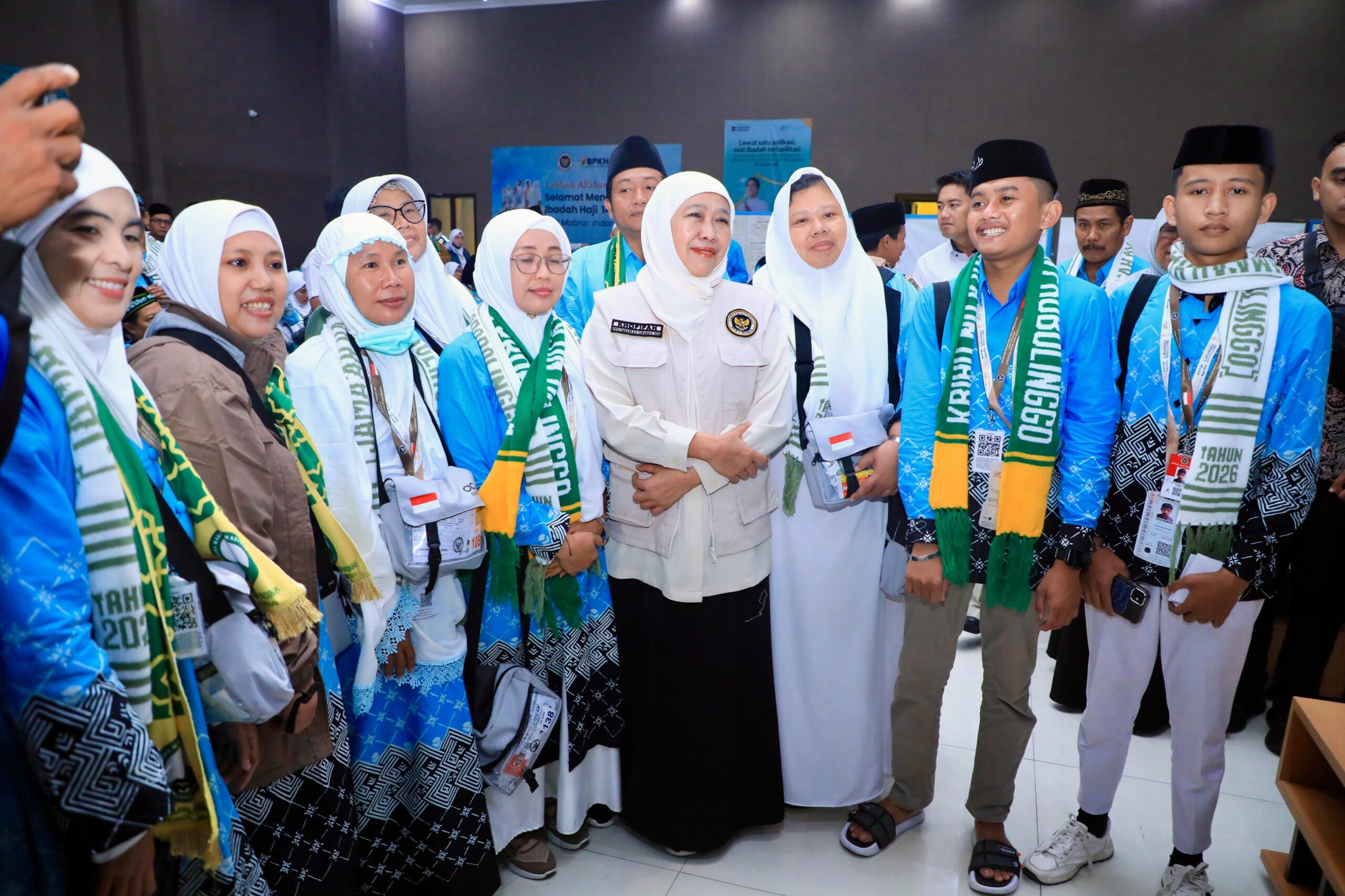 SURABAYA, 22 APRIL 2026 – Gubernur Jawa Timur Khofifah Indar Parawansa melepas keberangkatan jemaah haji kelompok terbang (kloter) pertama Embarkasi Surabaya Tahun 1447 H /  2026 M dari Asrama Haji Surabaya, Rabu (22/4).