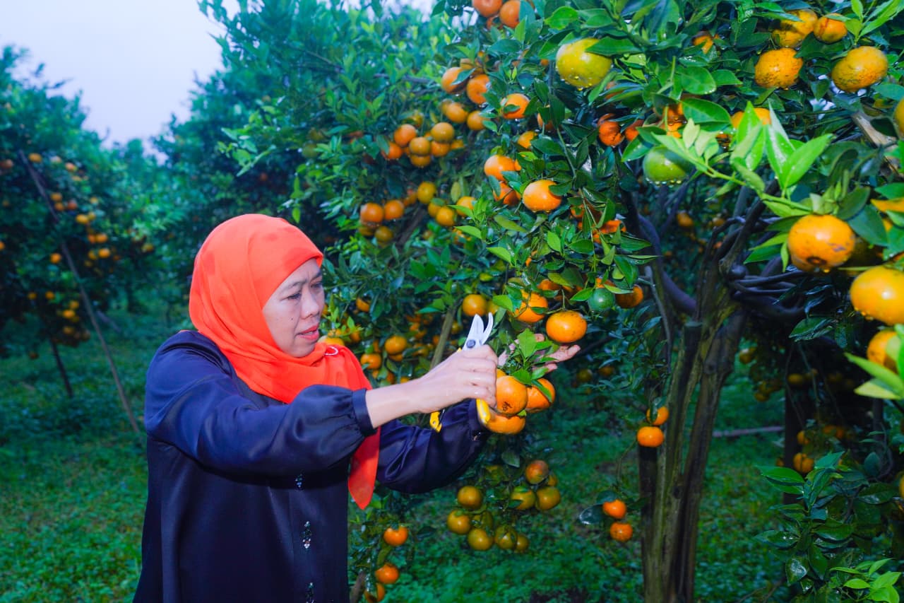 Pujian tersebut disampaikan Gubernur Khofifah saat melakukan panen dan petik buah jeruk di Kebun Jeruk milik Haji Super, Selasa minggu lalu.