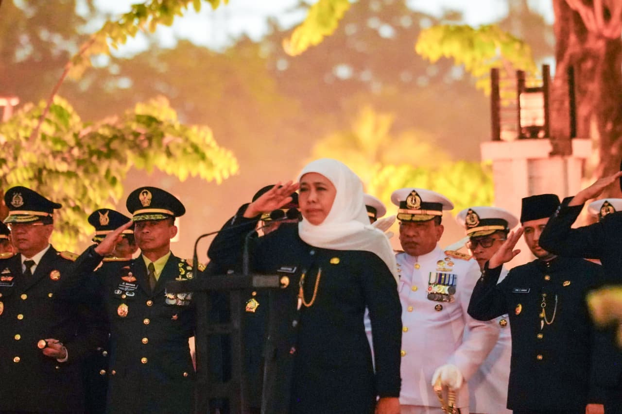 Gubernur Khofifah menyampaikan bahwa apel kehormatan dan renungan suci bukan sekadar seremoni tahunan, tetapi momentum untuk meneguhkan kembali semangat perjuangan, keteladanan, dan nilai pengabdian para pahlawan bangsa.
