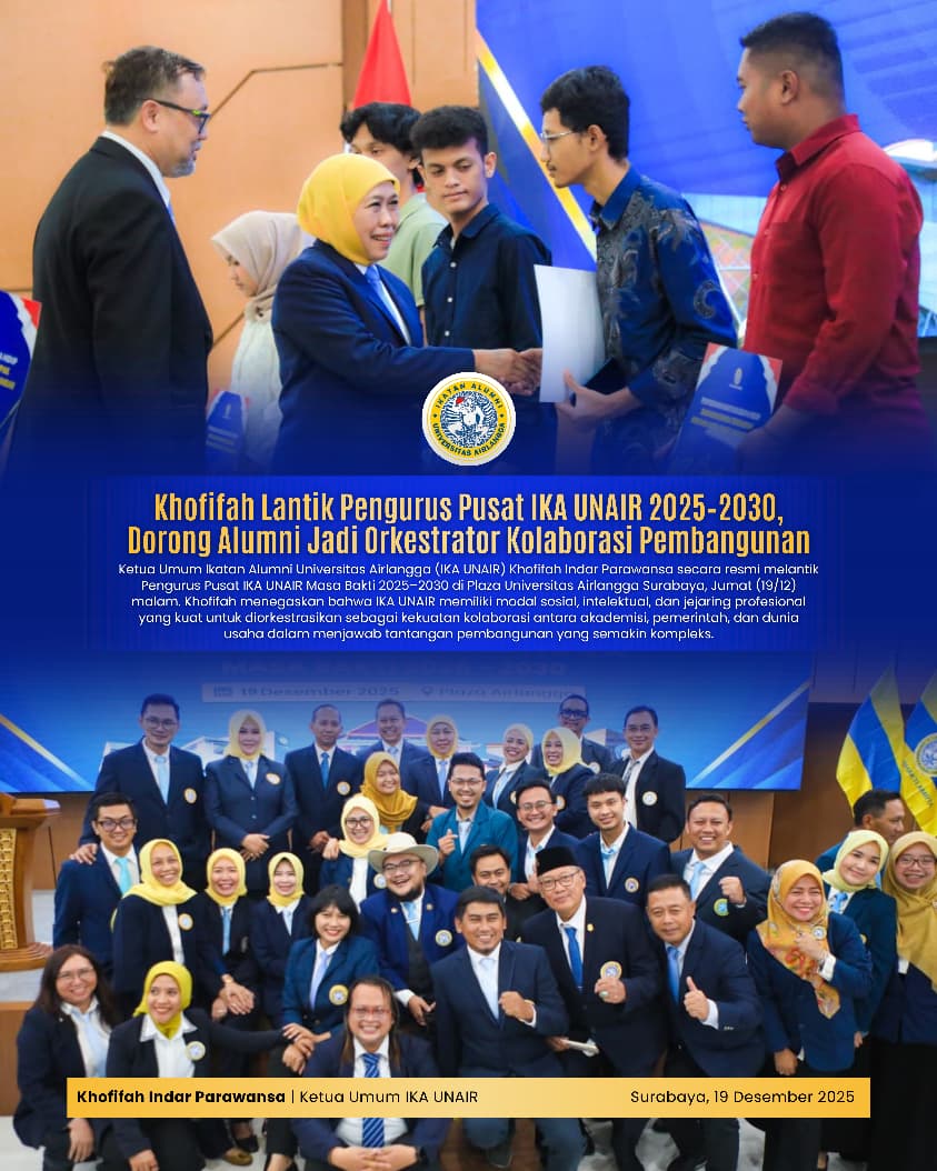 SURABAYA, 20 DESEMBER 2025 – Ketua Umum Ikatan Alumni Universitas Airlangga (IKA UNAIR) yang sekaligus Gubernur Jawa Timur Khofifah Indar Parawansa secara resmi melantik Pengurus Pusat IKA UNAIR Masa Bakti 2025–2030 dalam prosesi yang digelar di Plaza Universitas Airlangga (UNAIR) Surabaya, Jumat (19/12).