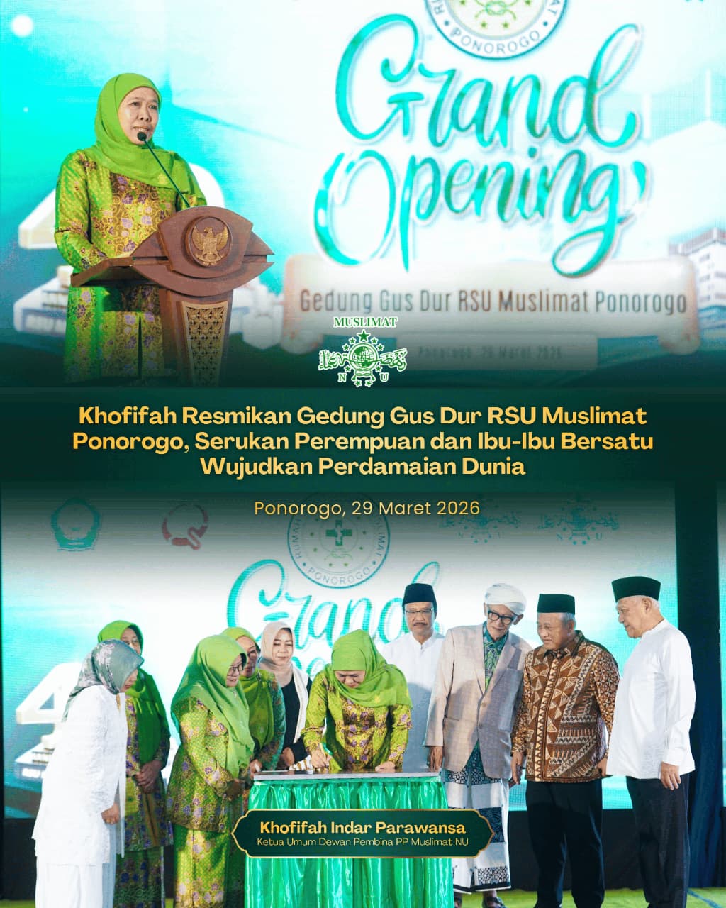 PONOROGO, 4 April  2026 – Ketua Umum Dewan Pembina PP Muslimat NU yang juga Gubernur Jawa Timur Khofifah Indar Parawansa meresmikan Gedung KH. Abdurrahman Wahid (Gus Dur) RSU Muslimat Ponorogo, Minggu lalu  sebagai penanda penguatan layanan kesehatan inklusif berbasis keumatan sekaligus modernisasi fasilitas kesehatan di daerah.