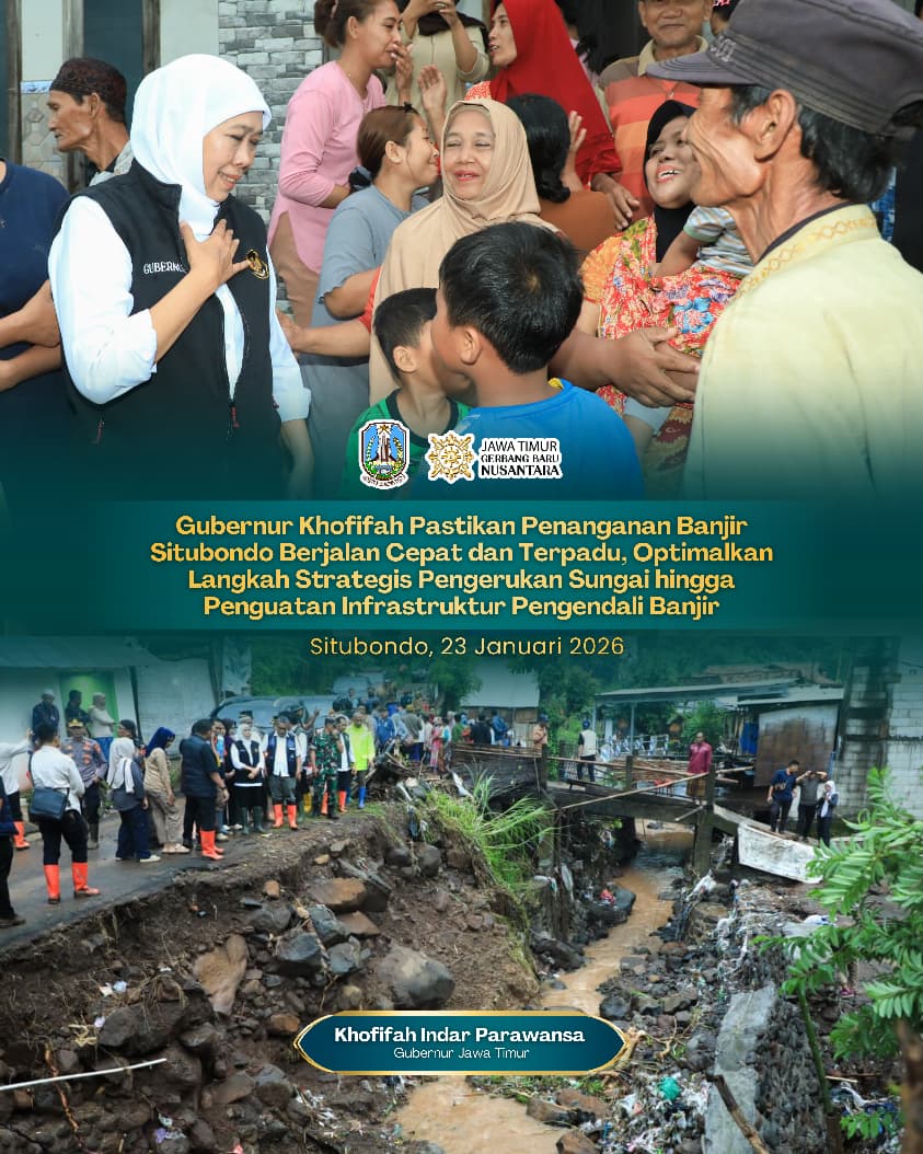 SITUBONDO, 24 JANUARI 2026 – Gubernur Jawa Timur Khofifah Indar Parawansa bergerak cepat turun langsung menangani banjir yang melanda Kabupaten Situbondo, dengan meninjau lokasi banjir di Desa Kalianget Kecamatan Banyuglugur, Kabupaten Situbondo, Jum'at (23/1).