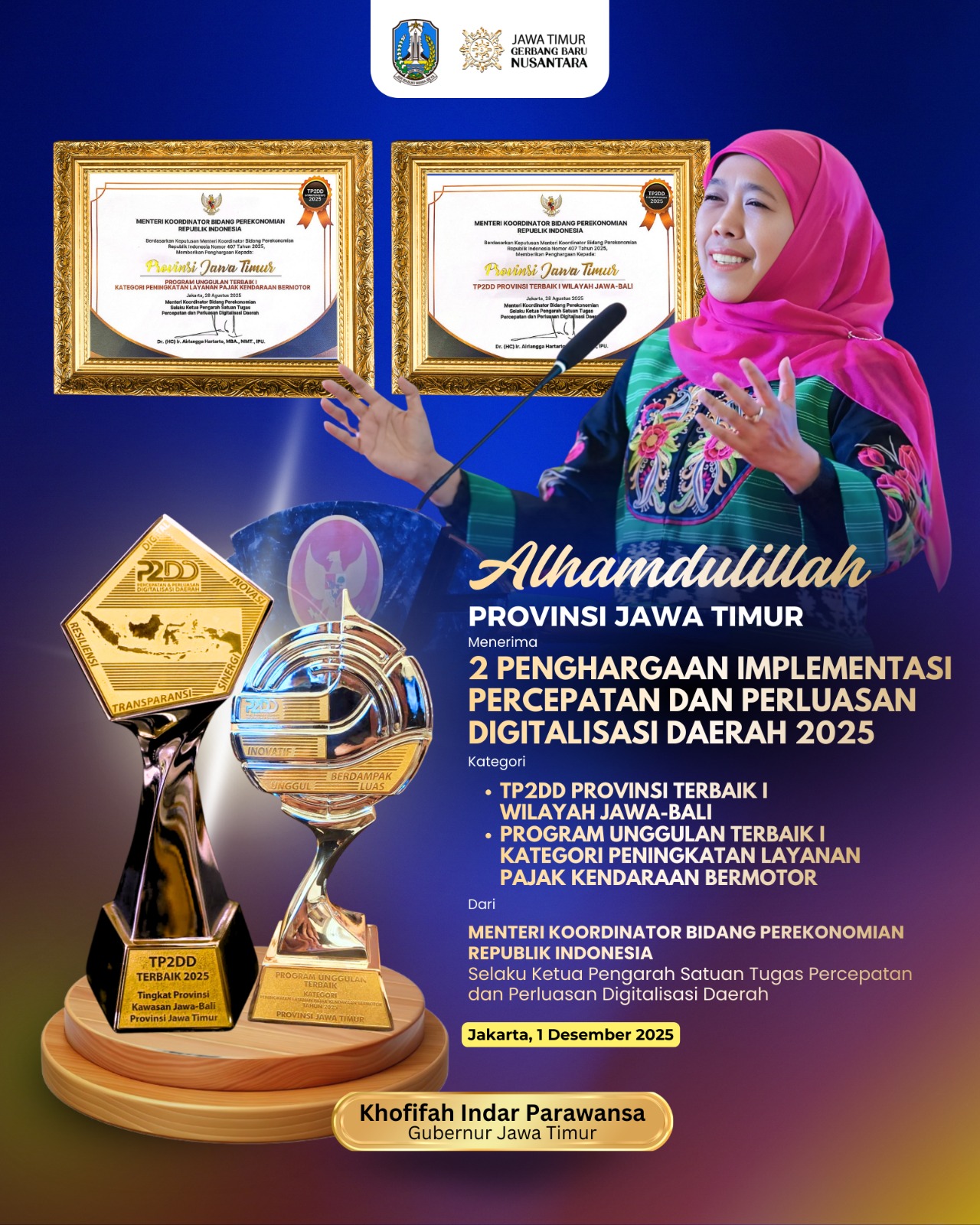 Provinsi Jawa Timur kembali mencatatkan prestasi gemilang dengan meraih dua penghargaan terbaik pertama Implementasi Percepatan dan Perluasan Digitalisasi Daerah Terbaik Tahun 2025 dalam ajang Implementasi Tim Percepatan dan Perluasan Digitalisasi Daerah (TP2DD) yang diselenggarakan Kementerian Koordinator Bidang Perekonomian RI di Ballroom Hotel Kempinski Jakarta, Senin (1/12).