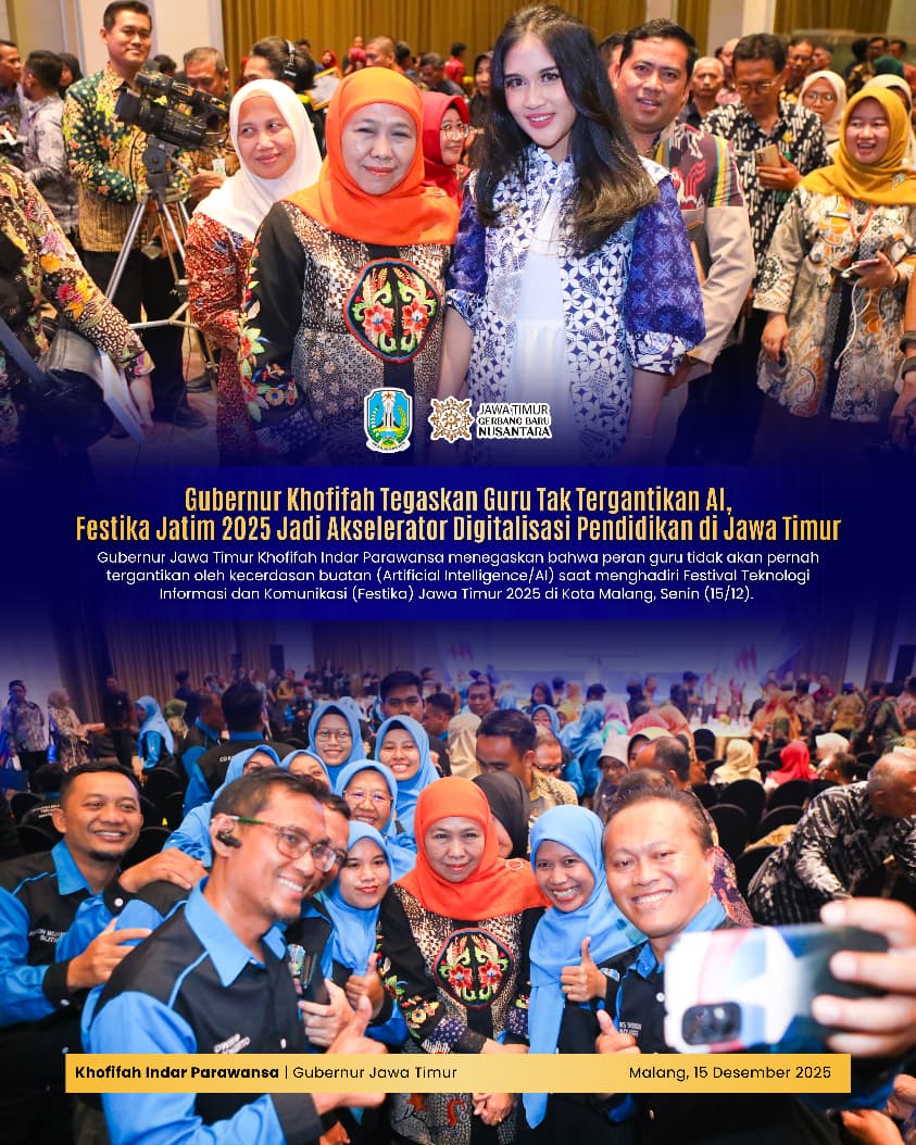 Gubernur Khofifah menekankan bahwa di tengah pesatnya perkembangan teknologi dan kecerdasan buatan (Artificial Intelligence/AI), peran guru tetap menjadi kunci utama dalam membentuk karakter dan kualitas generasi penerus bangsa.