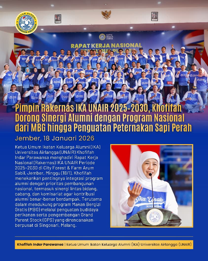 Ajakan tersebut disampaikannya saat menghadiri Rapat Kerja Nasional (Rakernas) IKA UNAIR Periode 2025–2030 di City Forest, Jember, Minggu (18/1).