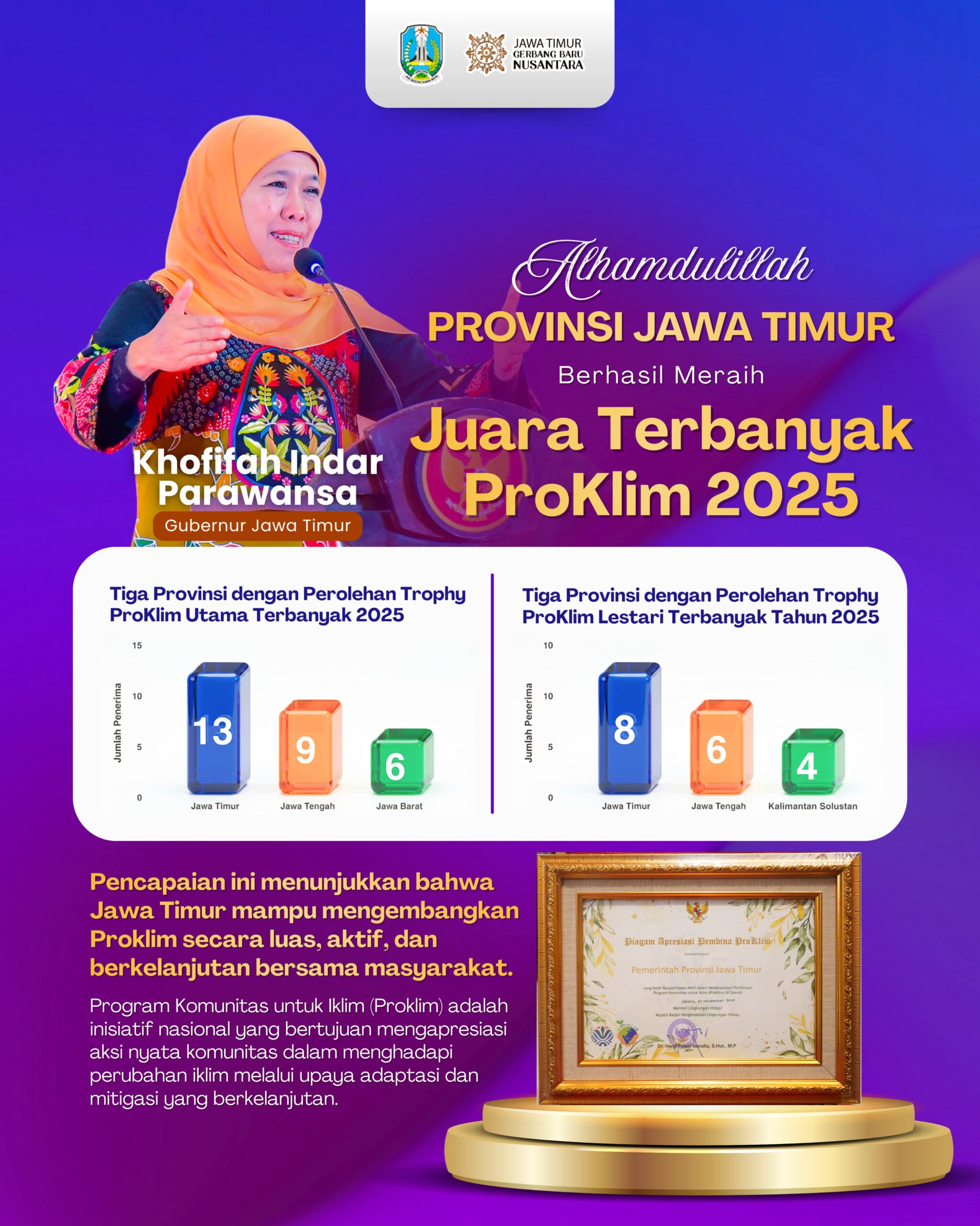 SURABAYA, 4 DESEMBER 2025 – Provinsi Jawa Timur memborong gelar juara dalam ajang Program Komunitas untuk Iklim (ProKlim) Indonesia Tahun 2025 yang diselenggarakan Kementerian Lingkungan Hidup.