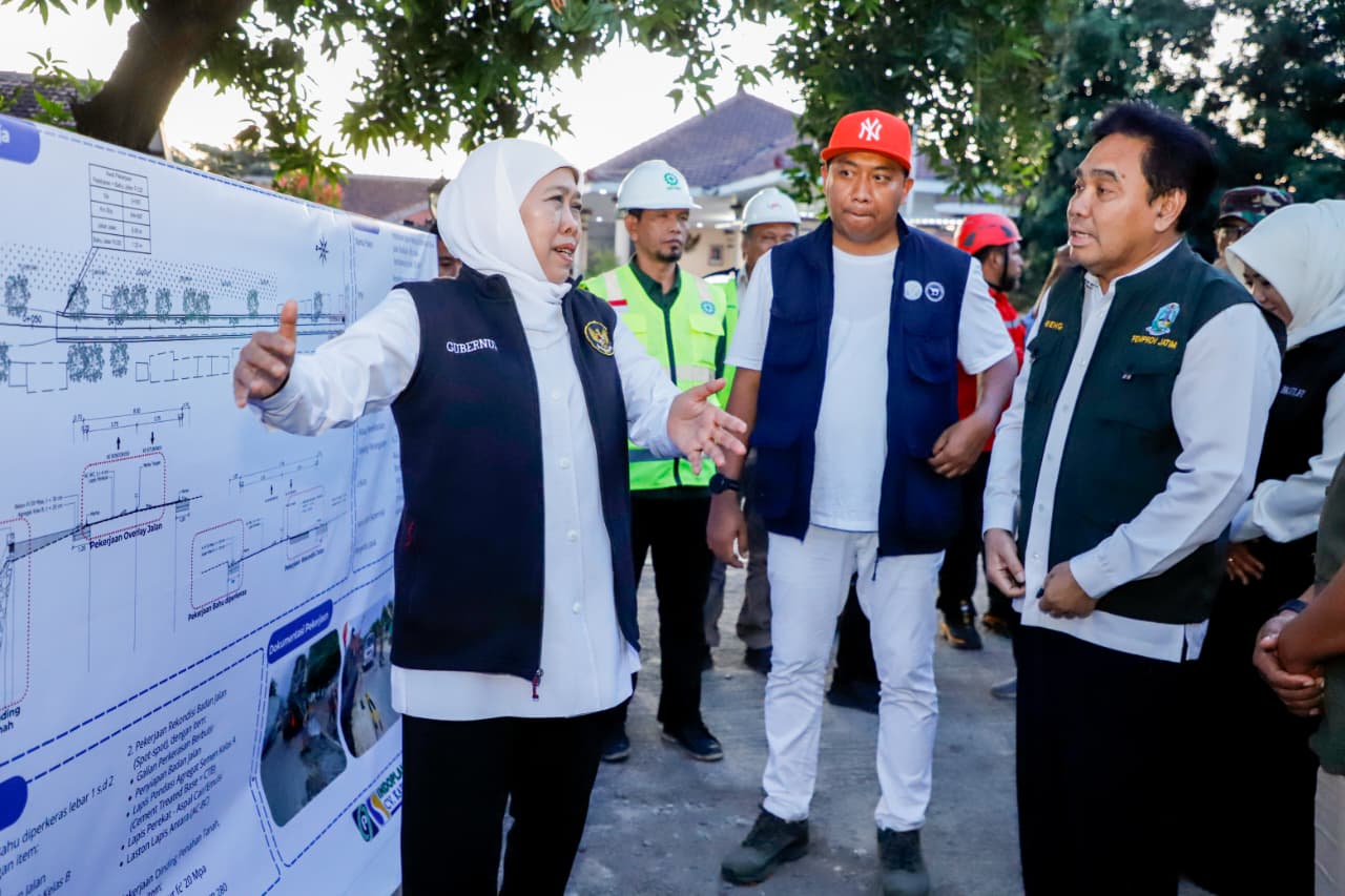 Didampingi Bupati Situbondo Yusuf Rio Wahyu Prayogo dan Kepala Dinas PU Bina Marga Jawa Timur, Edy Tambeng Widjaja, Gubernur Khofifah menyusuri sekaligus melihat kondisi jalan yang tengah dalam proses pelebaran.