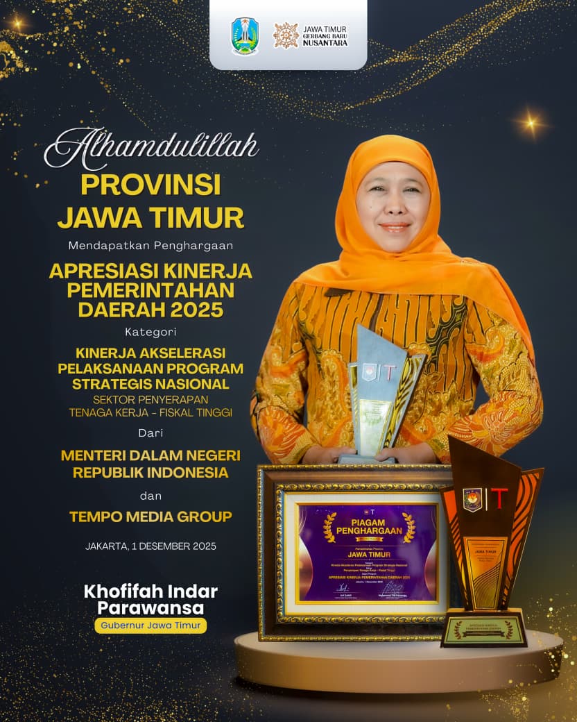 JAKARTA, 2 DESEMBER 2025 – Pemerintah Provinsi Jawa Timur meraih penghargaan sebagai provinsi Penyerapan Tenaga Kerja dengan Fiskal Tinggi pada Malam Apresiasi Kinerja Pemerintahan Daerah Tahun 2025 di Hotel Borobudur Jakarta, Senin (1/12).