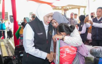 Gubernur Jawa Timur Khofifah Indar Parawansa menyampaikan ucapan selamat kepada Firsta Yufi Amarta, perwakilan Jawa Timur yang berhasil meraih gelar Puteri Indonesia 2025 dalam perhelatan Grand Final Puteri Indonesia 2025 yang digelar di Plenary Hall, Jakarta Convention Center, Jumat malam (2/5/2025).