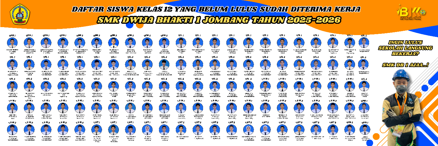 Sekolah menengah Kejuruan Dwija Bhakti (SMK DB) 1 Jombang terus menunjukkan komitmennya sebagai lembaha Pendidikan kejuruan yang menghasilkan lulusan siap kerja. Saat ini terdapat lebih dari 130 siswa kelas XII dari berbagai jurusan di SMK Dwija Bhakti 1 Jombang telah memulai bekerja di berbagai perusahaan mitra industri, bahkan sebelum mereka resmi menyelesaikan Pendidikan di bangku sekolah.