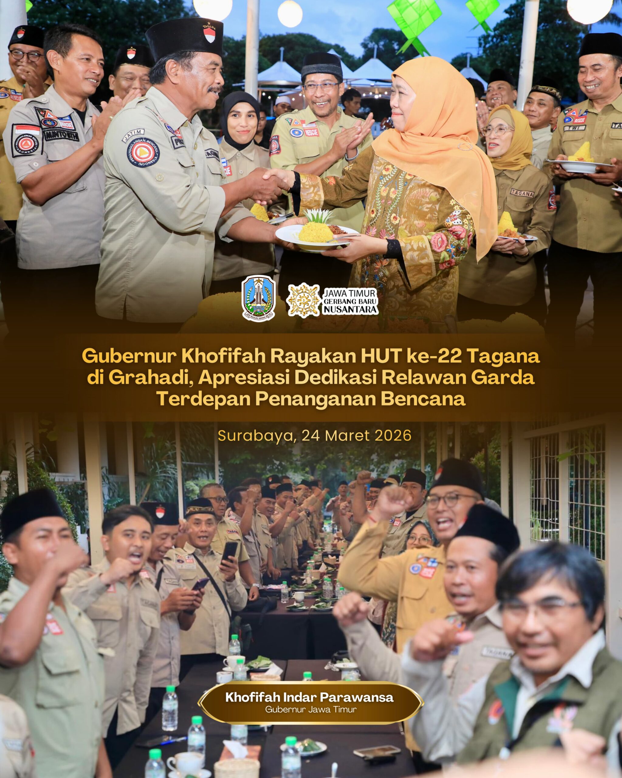 SURABAYA, 25 MARET 2026 – Gubernur Jawa Timur Khofifah Indar Parawansa menggelar tasyakuran HUT ke-22 Taruna Siaga Bencana (Tagana) bersama pilar sosial di Gedung Negara Grahadi, Surabaya, Selasa (24/3).