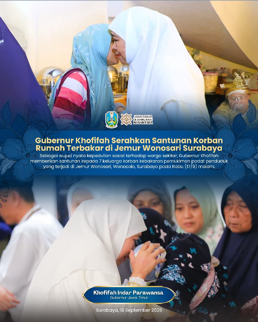 Gubernur Jawa Timur Khofifah Indar Parawansa menyerahkan santunan bagi 7 keluarga korban rumah terbakar di Jemur Wonosari Surabaya. Sebagaimana diketahui 7 keluarga tersebut mengalami musibah kebakaran rumah tepatnya terletak di Gang Masjid, Jemurwonosari, Wonocolo, Surabaya, pada Rabu malam (17/9/2025).